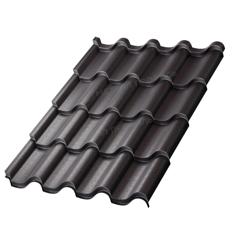 Профиль Монтерроса-SL характеризуется симметричной волной, имитирующей классическую черепицу с плавными изгибами. Высота волны достигает 25 мм, а шаг — 350 мм, что обеспечивает легкость монтажа и отличную жесткость листа. Толщина металла 0,5 мм гарантирует баланс между весом и прочностью, позволяя выдерживать снеговые нагрузки до 150 кг/м². Этот профиль отличается скрытым креплением, что придает крыше аккуратный вид без видимых саморезов. В черном цвете он подчеркивает современный дизайн, гармонично сочетаясь с фасадами из кирпича или дерева.